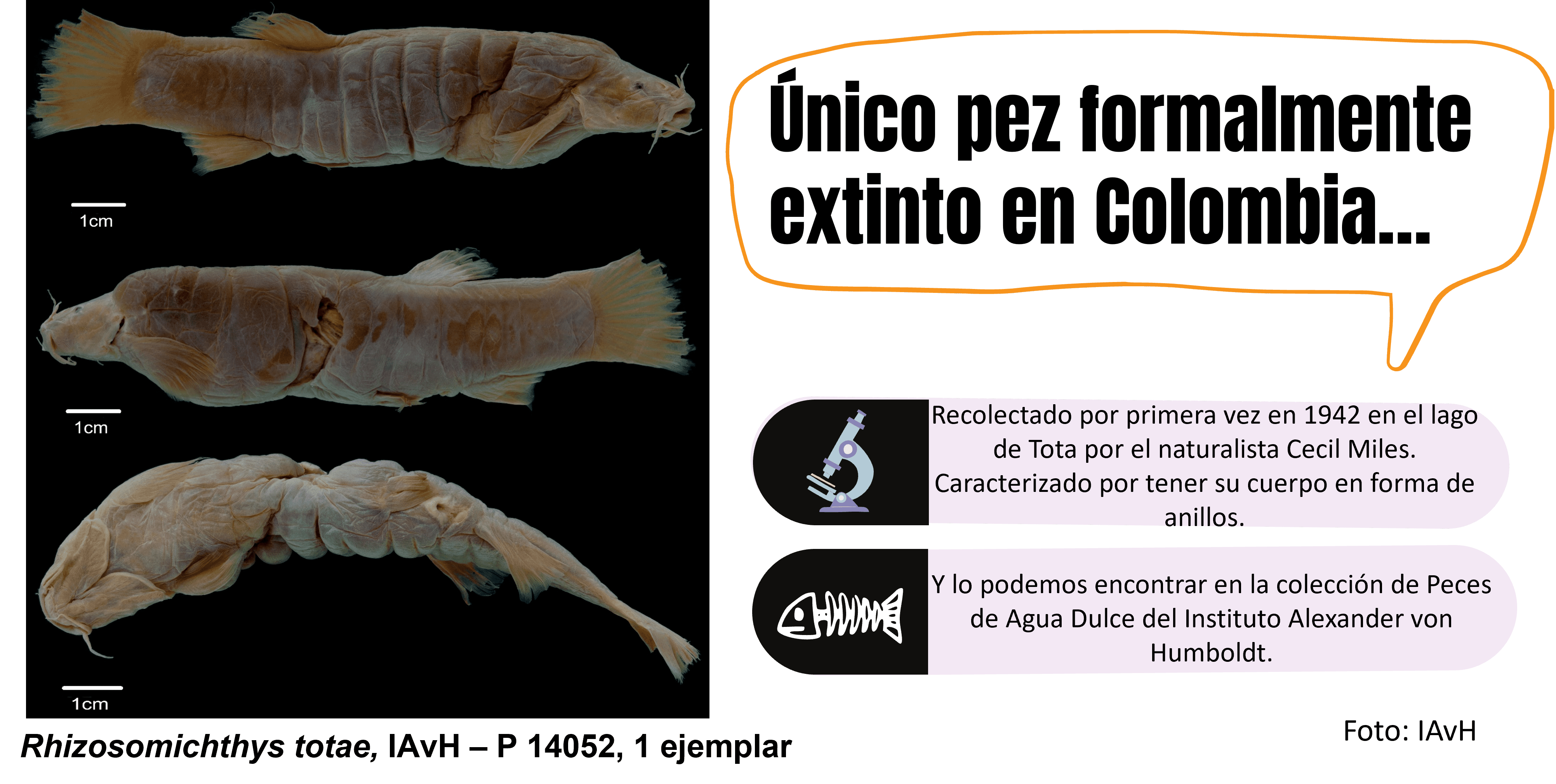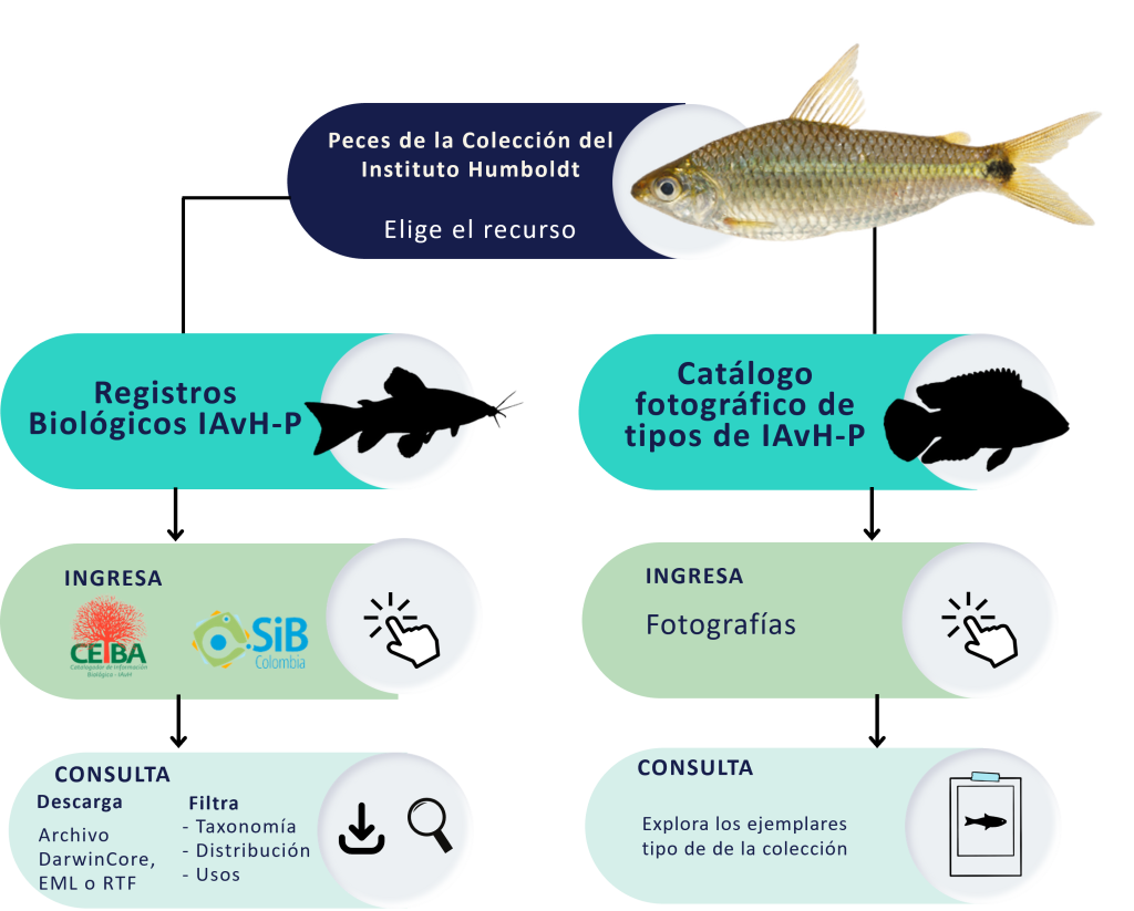 La colección de peces de agua dulce del instituto Humboldt (IAvH-P) nace en 1971 en Bogotá, con 2691 lotes provenientes del antiguo Instituto Nacional de los Recursos Naturales Renovables y del Ambiente (INDERENA).  En 1995 fue trasladada a su sede actual; el Claustro de San Agustín en Villa de Leyva. Hoy en día, es uno de los repositorios ictiológicos más grandes de Colombia con más de 29000 lotes catalogados y sistematizados. Contiene muestras de unas 1150 especies (aproximadamente el 74% de especies dulceacuícolas reportadas en Colombia), capturadas en unas 3100 localidades de los principales sistemas hidrográficos del país, junto con ejemplares provenientes de Brasil, Costa Rica, Ecuador, Guayana Francesa, Guyana, Panamá, Perú y Venezuela. Todos los registros se pueden consultar a través de las plataformas SIB-Colombia, GBIF y CEIBA.